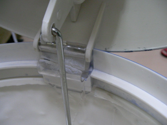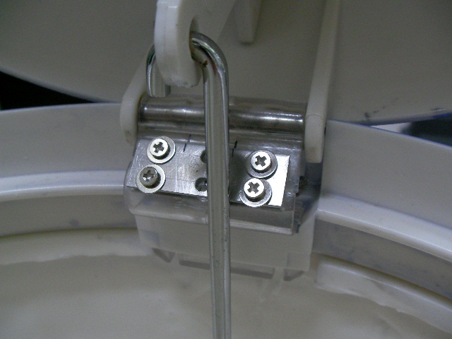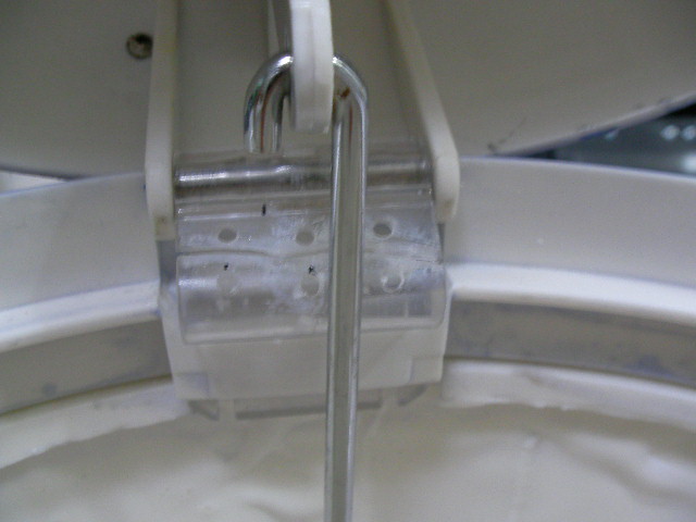 写真中央の透明なプラスチックが割れた場合、U字型の金具から頭がはずれるので、穴明けを行う際には別々に明けた方がやりやすいです。電動ドリルでやろうと思いましたが、勢いあまって割ってしまったら始末が悪いので、根気良く、100円ショップで買ったドリル(Φ3.0mm)で穴をあけました。30分くらいかかりました。