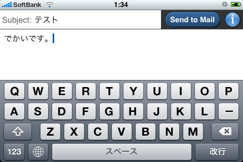 右上のSend to Mailをタップすると、通常のメール画面に遷移して、入力したテキストが反映されています。
