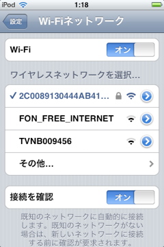 左がiPod Touch、右がiPhoneです。家でWifiをONにした状態のWifiネットワーク画面ですが、TV&バッテリーのSSIDも表示されません。
