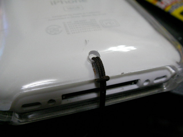 touchの時も困りましたが、ストラップがつけられません。そこで、TUNEWEAR tuneshell iphone 3G plusを買ってきて、穴をあけました。